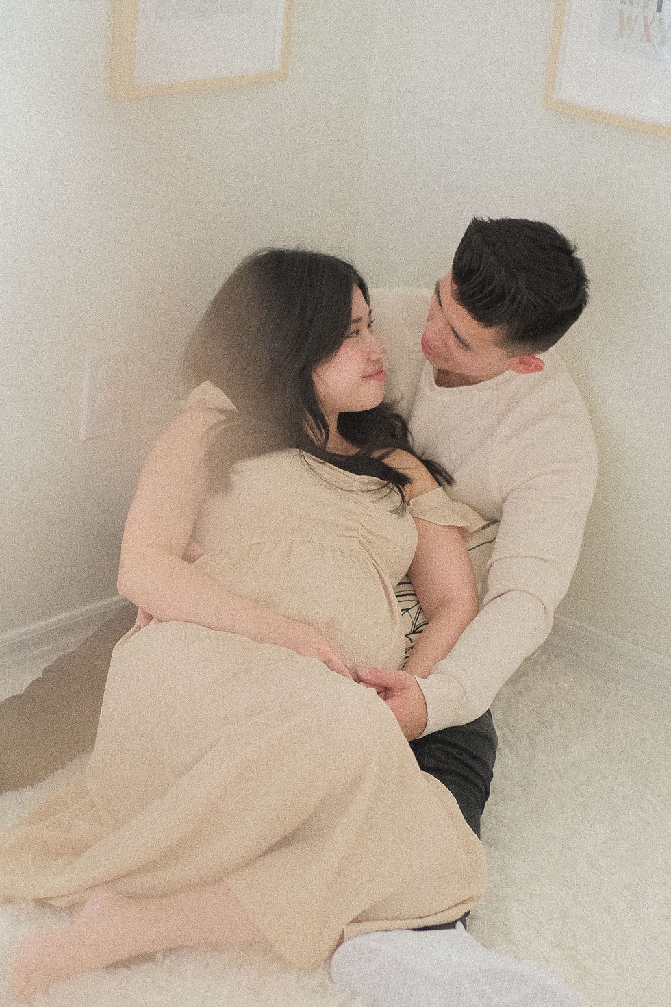 cozy in-home maternity session, soft and dreamy, minimalist vibe, grainy photos